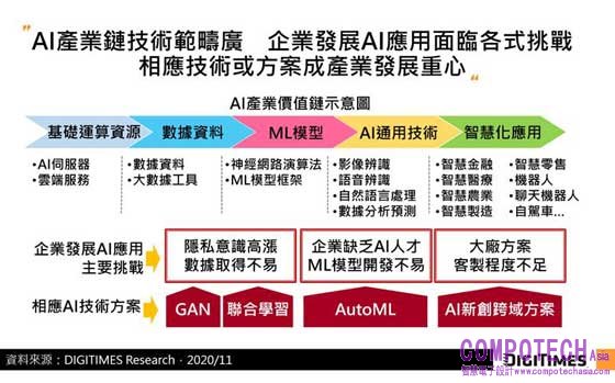 AutoML解決了過去ML訓練模型費時的問題,也緩解AI人才不足困境。由於各產業對AI應用的客製化需求較高,目前AI產業鏈中上游科技大廠所推出的解決方案無法逐一滿足企業需求,如何銜接落差造就AI新創業者商機。AI新創業者鎖定特定垂直領域落地驗證市場並累積實力,近來已朝提供跨領域解決方案發展,漸於AI產業鏈中上游與既有科技大廠產生競爭關係。