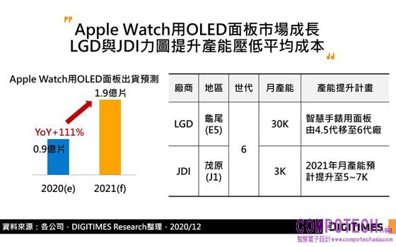 展望2021年,搭載OLED面板的手機出貨量比重可望達4成,另外,近來也成為中小尺寸OLED面板重要應用的智慧手錶方面,領導者蘋果Apple Watch 2021年搭載OLED面板出貨量預估年增1倍,促使兩大供貨廠LGD與日本顯示器(Japan Display Inc.;JDI)加緊腳步提升產能。