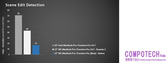 受益於 Apple M1 晶片對機器學習的支援,Adobe Sensei人工智慧技術支援的功能也得到提升,如場景變換偵測。此外通過 Rosetta 2 轉譯機制使用目前釋出的 Premiere Pro 版本,相關應用的速度上也會得到提升。
