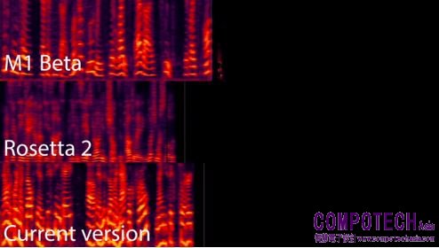 如圖所示為在 M1 Beta 版、Rosetta 2 及當前版本 Audition 中以 16K 點 FFT 頻譜的即時渲染效果。
