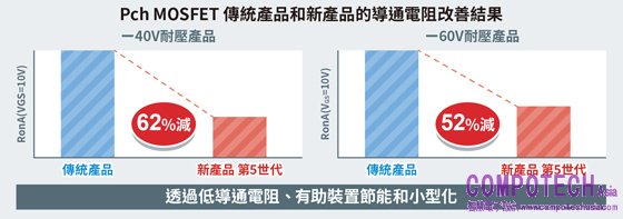 本系列產品是ROHM擁有優異市場實績的Pch MOSFET產品,採用了第五代新微細製程,具備了業界超低單位面積導通電阻*3。耐壓-40V產品的導通電阻較傳統產品降低62%、耐壓-60V產品的導通電阻較傳統產品降低52%,有助提升應用裝置的節能性和小型化。
