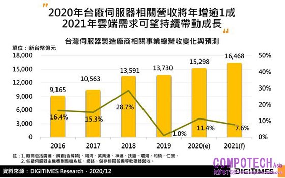 根據DIGITIMES Research分析師龔明德調查,2020年台廠包含伺服器主機板、整機系統、機房網路與儲存等軟硬體設備營收估年增11%,逾新台幣1.5兆元,優於台廠伺服器出貨量表現(年增7%),主因產品朝高效能運算(HPC)、高密度機櫃等較高單價機種發展,加上雲端資料中心需求帶動儲存、網路相關設備出貨增加。展望2021年,預期在美系及中系大型資料中心需求持續看增下,台廠伺服器相關營收可望保持成長,預估年增7.6%。