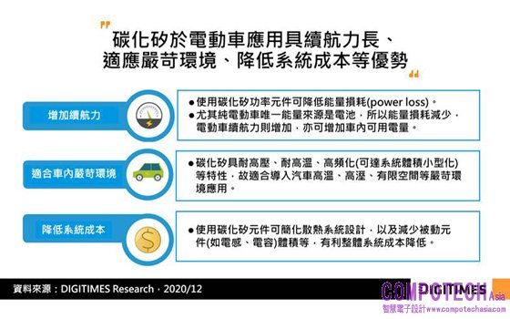 在功率元件領域中,車廠漸提高碳化矽功率半導體採用比重,主因碳化矽能耗低,可增加電動車續航力、碳化矽耐高溫及高壓等,適合車內嚴苛環境使用,且碳化矽可減少周邊零部件體積,達到降低系統成本優勢,根據英飛凌(Infineon)預測,至2025年車載功率半導體中,碳化矽佔比將達25%。