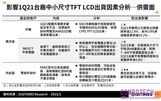 2021年2月5日--根據DIGITIMES Research分析師楊仁杰統計,2020年第4季台廠中小尺寸TFT LCD面板出貨量為1.93億片,較前季減少25.3%、年減17.8%,主因美國對中國大陸大廠華為出貨禁令生效,加上NB及10吋以上大尺寸平板電腦面板需求提升,台廠多減少中小尺寸面板產能所佔比重。2021年第1季,雖智慧型手機市場需求未減,但因驅動IC等零組件供應不足,加上歷年的年假工作時數減少,預估台廠中小尺寸TFT LCD面板出貨量將為1.74億片,季減9.5%,但相較受新冠肺炎(COVID-19)衝擊嚴重的2020年同期,仍將有3.9%的成長。