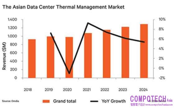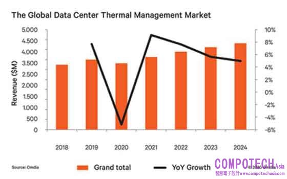 Omdia預測液體冷卻系統將展現強勁的成長動能-從2020年至2024年,浸沒式與晶片導向冷卻系統預計將增長一倍。此成長動力來自許多方面,包括晶片與伺服器的耗電量攀升、邊緣網路擴張、機架密度增加,以及日益嚴苛的節能和環保要求。