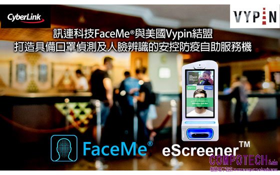 2021年3月9日--全球頂尖 AI 臉部辨識領導廠商訊連科技(5203.TW) 宣布與美國 Vypin 策略結盟,將訊連 FaceMe® SDK 整合至美國 Vypin 的 eScreener™防疫 KIOSK 自助服務機,打造具備人臉辨識、口罩偵測、感應式手部消毒及偵測體溫功能的非接觸性安控防疫解決方案。