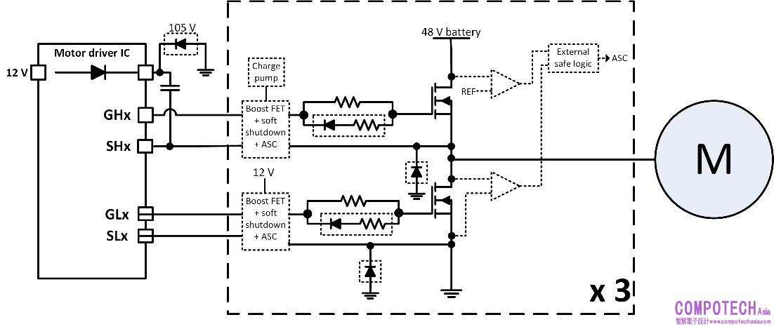 由於引擎空間有限,因此 48-V 馬達驅動器系統必須具備較小的電路板尺寸。圖 3 說明傳統 48-V 高功率馬達驅動器設計的典型馬達驅動器方塊圖。執行具強大防護的安全馬達驅動器系統時,必須具備鉗位二極體、外部驅動電路、散熱路徑電阻器與二極體、比較器及外部安全邏輯元件。這些外部零組件會增加電路板空間與系統成本。