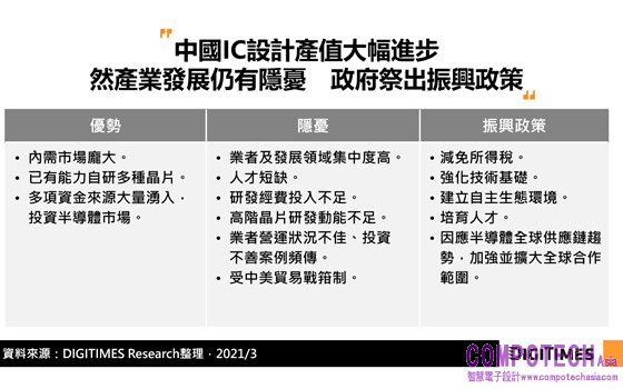 2020年中國大陸IC設計產值成長24%,規模再創新高,中國官方基於半導體為關鍵產業,以建立自主可控半導體生態圈為長遠目標,因此持續祭出優惠政策、資金挹注,吸引多家IC設計業者成立,前十大業者佔整體產值近5成,若以產業領域劃分,通訊佔比逾4成。因美方對中國主要科技業者的箝制動作不斷,分散應用市場及降低產業集中度或為中國今後發展IC設計產業可思考的方向之一。