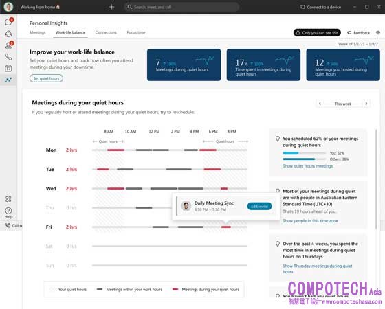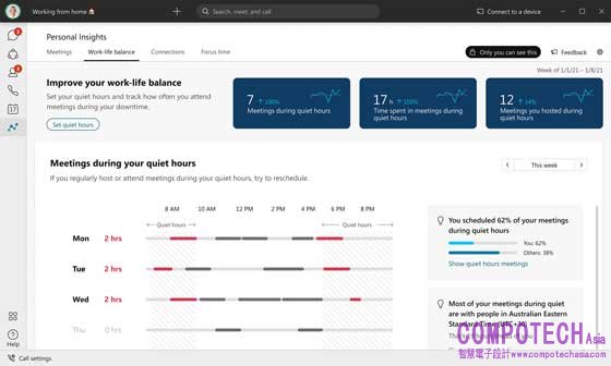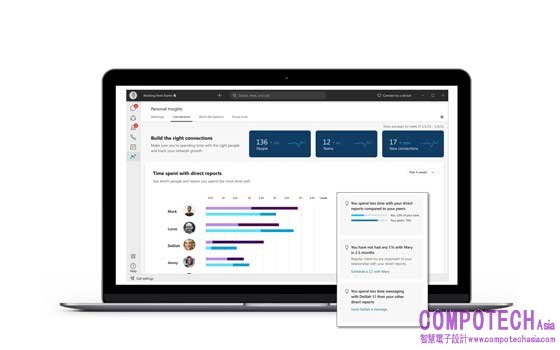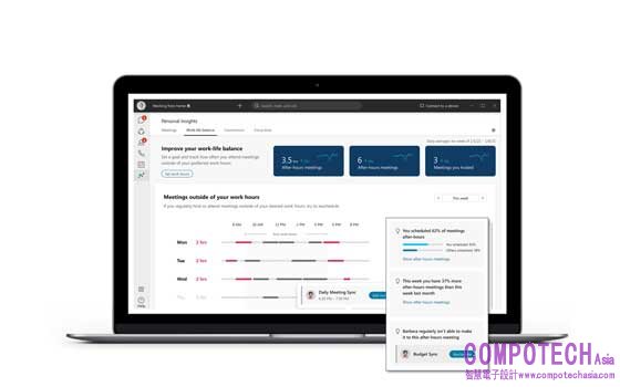 • 個人洞察力:這些僅向個人提供的洞察力可顯示每日趨勢和互動情況(例如主要的合作夥伴及活動),以便用戶設置和監測個人偏好。這可使用戶與同事進行更有效的交流,將時間集中在最重要的事情上。例如,用戶有多經常接受其從不參加的會議、在會議期間同時處理其他事務、或選擇不開啟鏡頭?People Insights將幫助用戶決定何時拒絕會議或重新安排會議時間,以確保這能滿足用戶的個人工作偏好和目標。它還可以幫助用戶充分參與(可視化用戶在活躍的會議期間同時處理任務和開啟鏡頭習慣),使用戶能更專注地給予其他與會者更充分的關注和提升參與度。