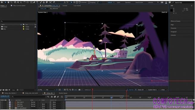 • After Effects 的 3D地平面功能 (3D Ground Plane) 添加水平線、消失點及網格功能,協助設計師精準定位及對齊物件。