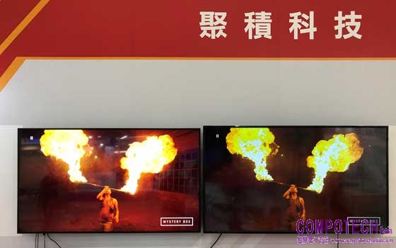 2021年4月22日--聚積科技參與2021智慧顯示展覽會,展位位於mini-/ micro-LED主題館,這次展出的焦點為mini-LED背光技術與傳統背光源技術的正面對決。我們對比尺寸均為65吋的LCD電視,同時播映4K畫質影片,可以發現兩者的明顯差異:昏暗畫面中的細節清楚可辨;在明亮畫面中除了看得到細部紋理外,顯示畫面鮮明色彩的程度亦大幅超越傳統背光源技術。造成前述差異的原因在於顯示器面板下的發光板是由數千顆mini-LED燈點組成,當顯示明亮畫面時,畫面下的燈點依畫面發光程度有層次地被點亮,可實現至少1,000 nits的超高亮度,比傳統背光源亮度提高數倍;而昏暗畫面下的燈點則是呈現具層次的微亮到完全關閉,亮度接近於 0,對比度相對更高。因此,採用mini-LED背光源技術所達成上千區的「區域調光」功能,實現高動態對比(HDR)與區域獨立調光功能。此次mini-LED背光源展品內建聚積LED驅動晶片,區域調光共1,152區,可達到HDR1000 (最高亮度1000 cd/m2)規格,並由合作夥伴A2V陣列視覺團隊設計陣列光型(Array Vision) mini-LED燈板,搭配精準區域調光演算法(Array Plus)以及TFT面板像素補償技術(Pixel Compensation Tech),有效降低mini-LED區域調光常見的光暈問題。