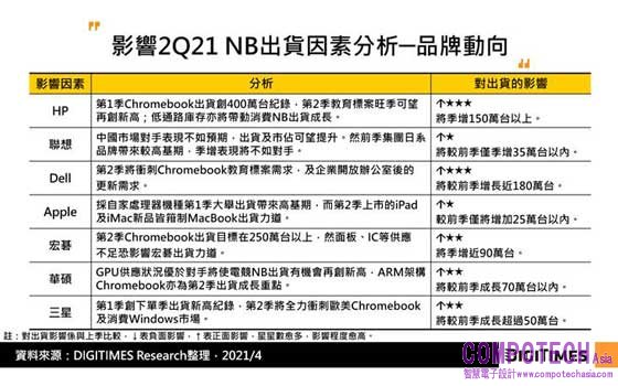 第2季前六大品牌出貨皆將較前季成長,龍頭惠普(HP)將繼續衝刺破紀錄的Chromebook出貨;第二名聯想因前季日本GIGA School標案進入尾聲,季增表現將不如對手;第三名戴爾(Dell)則將同時衝刺北美教育標案及辦公室重啟商機,表現將優於對手。
