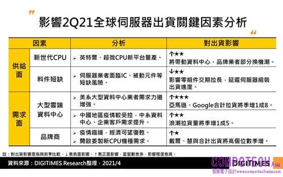 根據DIGITIMES Research分析師龔明德調查統計,因2020年下半伺服器拉貨力道較緩,2021年第1季部分資料中心業者需求開始回溫,加上擔心IC、零組件等短缺風險而較積極拉貨組裝伺服器,全球伺服器出貨量僅微幅季減1.6%,淡季不淡。第2季大型資料中心為因應雲端服務、電商平台需求,而品牌商受惠於企業客戶需求回升,加上英特爾(Intel)等新一代CPU將助長新機種拉貨力道,預估伺服器出貨量將季增1成4。