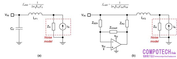圖1:傳統被動式濾波 (a) 與主動式濾波 (b) 電路執行應用方式