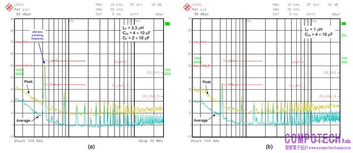 圖 2 以傳導式 EMI 測試為基礎,比較被動式與主動式 EMI 濾波器設計,使用峰值與平均偵測器來符合 Comité International Spécial des Perturbations Radioélectriques (CISPR) 25 Class 5 標準。每個設計都採用以 LM25149-Q1 同步降壓 DC/DC 控制器為基礎的功率級,從 13.5 V 汽車電池輸入提供 5 V 與 6 A 輸出。切換頻率為 440 kHz。