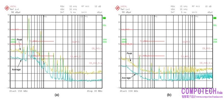 圖2:以同等功率級運作條件比較被動式濾波器解決方案 (a) 與主動式濾波器解決方案 (b)