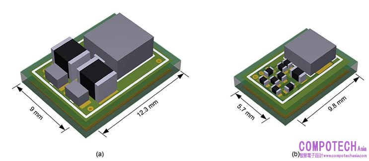 圖 4 說明產生圖 2 結果的被動式與主動式濾波器級印刷電路板 (PCB) 配置比較。電感器體積從 5 mm x 5 mm 降為 4 mm x 4 mm。此外,以使用電壓而降額定大幅下降的兩個 1210 電容器,改由數個小型且數值穩定的 0402 元件取代,以進行 AEF 感測、注入與補償。此濾波器解決方案可將板上配置減少近 50%,體積更可減少 75% 以上。