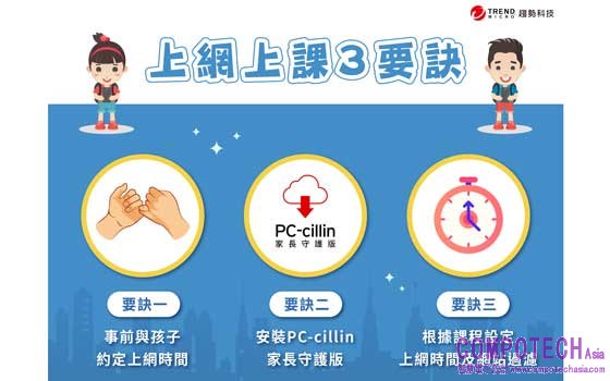 在資訊快速變化的網路環境中,家長與孩子都需要一起學習!趨勢科技分享「上網上課3要訣」,幫助親子常保持暢通良好的想法交流,共同擬定上網計畫並彼此提醒努力遵行,給予孩子在網路世界中保護自己的能力,用正確的態度面對網路世界中更多未知的挑戰。