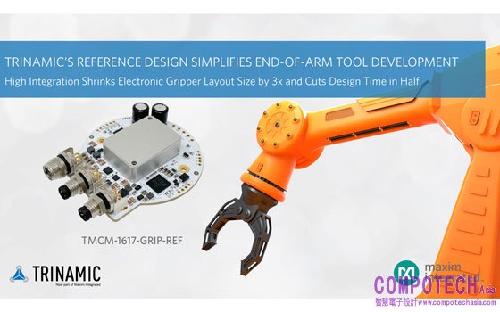 2021年5月27日--TRINAMIC Motion Control GmbH & Co. KG,現隸屬於Maxim Integrated Products, Inc (NASDAQ: MXIM),宣佈推出一款開源、全整合參考設計,有效簡化工業機器人的臂端(EoAT)開發。TMCM-1617-GRIP-REF參考設計整合了基於硬體的現場定向控制(FOC)和3個通訊連接埠,將電子機器人夾具的設計尺寸減小3倍,開發時間縮短一半。參考設計採用了Maxim Integrated的MAX22000工業級、高精度可配置類比輸入/輸出和MAX14906四通道數位輸入/輸出,用於調節Trinamic TMCM-1617單軸伺服驅動器的多種模式。