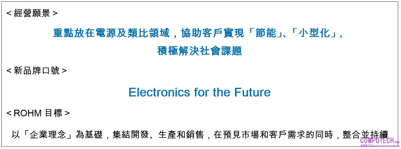 透過功率元件和車電LSI核心業務,達到營業額的大幅成長,同時進一步加強泛用元件和消費性電子設備LSI等產品的獲利能力,提高產品附加價值並實現業務本質的轉變。此外ROHM還將致力於針對未來發展創造新的成長業務。