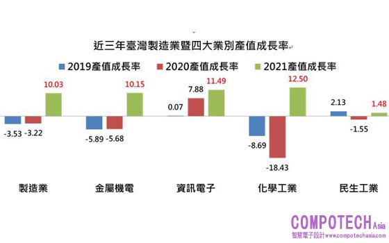 工研院綜整海內外政經情勢,今(3)日發布2021年臺灣製造業景氣展望預測結果,預測2021年製造業產值為20.92兆元新臺幣,產值成長率為10.03%,四大業別均正向成長。其中,金屬機電、資訊電子、化學工業等可望達雙位數成長。適逢臺灣正遭逢COVID-19疫情衝擊,工研院觀察,目前雖對臺灣製造業衝擊的影響有限,臺灣業者宜加速打造可抵禦疫情等外力衝擊的強韌產業生態鏈,積極導入數位化技術提升經營效率,形塑多元創新應用,發揮智慧臺灣價值。