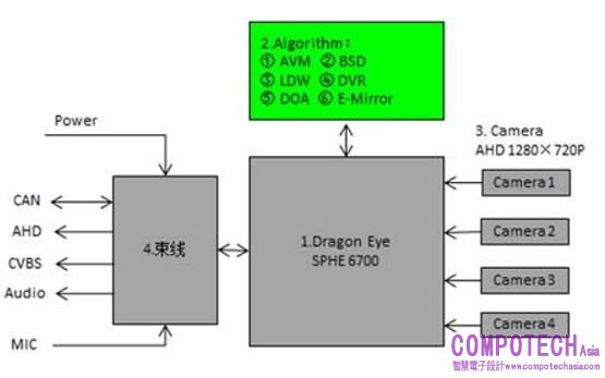 本方案採用Sunplus的SPHE6700作為方案主晶片,SPHE6700是用於ADAS應用的高度集成的汽車SoC。它不僅內置高性能的雙核Cortex-A9嵌入式處理器、3D GPU、4路高清輸入,全高清多格式解碼器以及H.264硬體編碼器,還設置了用於環繞視圖的AVM(環視監視器)引擎和高清視頻輸出接口,可運作在嵌入式Linux操作系統之中,支持3秒快速冷啟動,符合汽車電子應用。