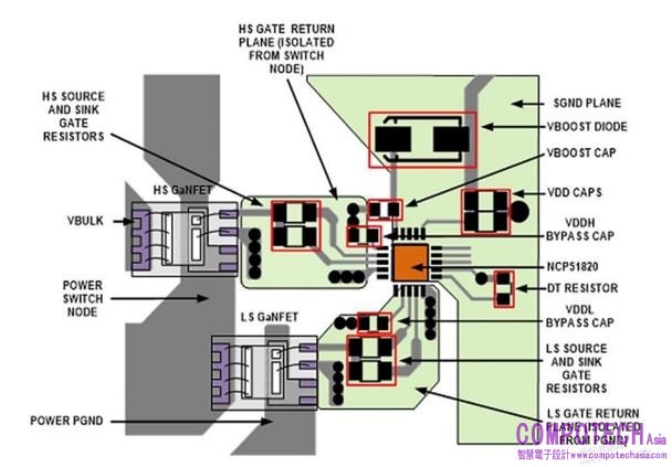 GaN驅動器對性能至關重要,驅動器使驅動電壓保持在電壓最大限值內並不是唯一的要求。對於快速開關,雖然GaN也有閘極電容的特性,但在閘極的有效串聯電阻和驅動器中功率被耗散。因此,使電壓擺幅保持最小很重要,理論上,GaN器件在VGS=0安全關斷,但實際上,即使是最好的門極驅動器,直接施加到門極的電壓也不可能是0V。所以,優化layout是成功的關鍵。採用ON Semiconductor的NCP51820在進行layout佈局時,能夠匹配門驅動迴路,並有助於產品微型化設計。將GaN器件和驅動器置於PCB同側,通過適當地使用接地/返回面來避免大電流通孔。