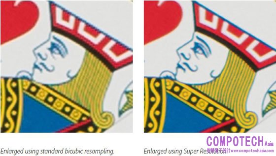 圖四:使用傳統雙立方插值取樣(bicubic resampling)進行放大(圖左)與使用超解析度功能進行放大(圖右)對照