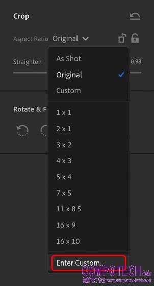 先前版本的 Lightroom 在裁切圖片時,用戶只能從預設的長寬比清單中選擇,或徒手劃定裁切的長寬比。現在最新版本的 Lightroom 可讓用戶直接輸入數值自訂任何想要裁切的長寬比。