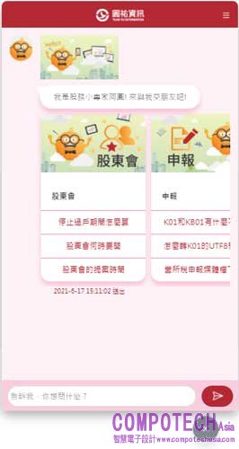 客戶可隨時在圓祐資訊官網或登入StockTime股務管理系統找到阿圓,諮詢各種股務作業問題,股務博士阿圓精通各項股務專業知識,擁有超過上千題的股務常見問題,例如:輸入「股東會」,阿圓會快速提供「股東會何時開」,「股東會是否要錄音錄影」等相關常見問題;且採用圖卡、選單等生動活潑互動方式,讓專業及法令問題口語化,創造良好的AI客服機器人(Chatbot)服務體驗。