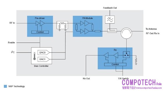 恩智浦RapidRF 參考板搭載高效的Doherty功率放大器多晶片模組,可透過線性化實現最高200 MHz瞬時頻寬,另外,在與數位預失真(Digital Pre-Distortion;DPD)結合使用的同時,可滿足監管機構的排放要求。此外,參考板亦內建用於數位預失真(Digital Pre-Distortion;DPD)回饋的耦合器,並且得益於恩智浦5G多晶片模組的50歐姆輸入/輸出整合,其緊湊型配置採用橫跨各個頻率和功率等級的通用PCB佈局。