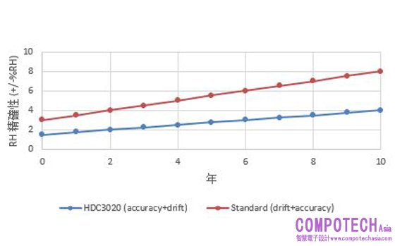 TI 設計的 HDC3020 RH 感測器,不僅可延長系統壽命,更可減少功耗。其架構可在完整供電的情況下提供準確的溫度與濕度:一般值1.5% RH 與最大值 2% RH,且每年長期漂移低於 0.21% RH。這些參數可幫助延長電器與其他系統的使用壽命,並可有效降低 50% 長期誤差,10 年後可從 8% 降至 4% RH,如圖 1 中所示。
