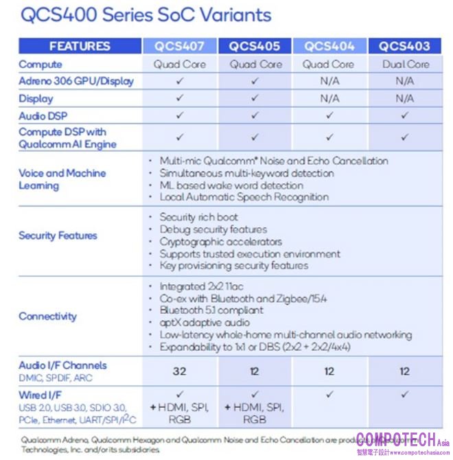 該家族目前擁有QCS403、QCS404、QCS405、QCS407。其中,QCS403/404分別搭載雙核/四核CPU,兩者都支持藍牙5.1;QCS405包含四核CPU, 並支持高通AI引擎(或平台),可以使用四核CPU、GPU和雙DSP來完成AI推論;QCS407則在QCS405的版本上為AV接收器提供更多音頻通道。