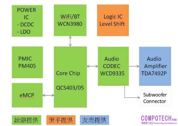 大聯大詮鼎基於QCS400系列SoC,再搭配PM405電源管理IC及WiFi前端IC - WCN3980,組成高性價比方案的智能音響參考設計方案。