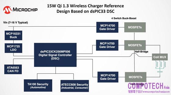 為支援Qi 1.3無線充電解決方案,Microchip提供dsPIC33C系列元件來運作Qi應用軟體和ECC608/TA100安全儲存子系統。後者由Microchip作為WPC認證的製造授權機構提供。作為一個整體的系統解決方案,該參考設計還整合了MIC4605和MCP14700柵極驅動器、MCP16331和MCP1725穩壓器、MCP6C02電流檢測元件、ATA6563 CAN收發器和MCP9700溫度感測器。