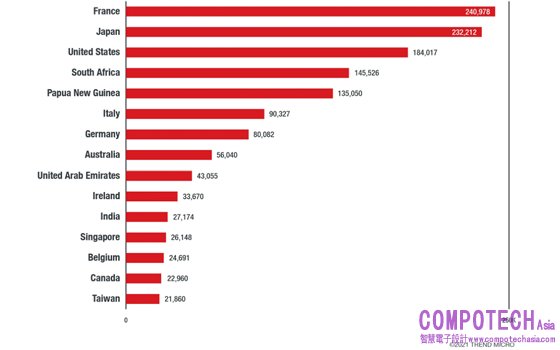 根據趨勢科技2021年1月至5月的統計,亞洲及歐洲是偵測到COVID-19疫苗相關威脅和攻擊次數最高的地區,其中台灣被偵測到超過2 萬次的攻擊名列全球15位,而日本和法國的被攻擊次數高達20萬次以上更是惡意軟體威脅受害最嚴重的國家,其原因可能來自於今年備受關注的賽事,如法國公開賽、環法自行車賽以及奧運等,觀眾及參賽者須具有疫苗接種證明,間接吸引網路犯罪分子的關注!亞洲及非洲攻擊次數增加,可能來自於第一季與第二季的COVID-19感染率增加,及疫苗施打尚未普及等原因。