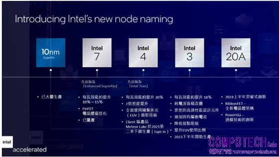 • Intel 4:全面使用極紫外光(EUV)微影技術,透過超短波長的光,印製極小的形狀。伴隨每瓦效能提升約20%,以及面積改進,Intel 4將於2022下半年準備量產,2023年開始出貨,client用戶端Meteor Lake和資料中心Granite Rapids將率先採用。