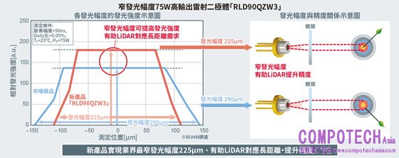 新產品「RLD90QZW3」使用了ROHM雷射二極體元件研發相關專利技術,因此當作LiDAR用的75W高輸出功率雷射二極體,具備了225μm的業界最窄發光幅度。另外,也藉由高密度發光達成了高光束性能。此外,除了在整體發光幅度範圍成功使發光強度更均勻外,且雷射波長的溫度依存性低至0.15nm/℃,不易受溫度變化的影響,因此可穩定發揮其性能。