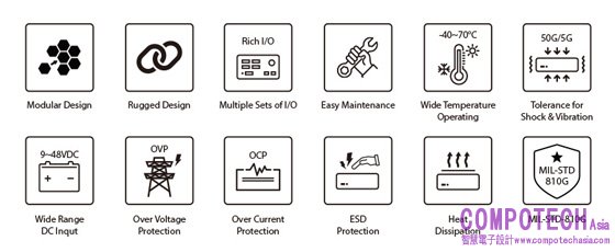 DS-1300系列的COM port、USB、PoE接口可連接紅外線感測器或是高速攝像頭,以判斷、檢測周圍環境避開障礙物並選擇到達目標的最有效路線;內建mini PCIe插槽,可加裝Wifi/4G/GPS模組,追蹤定位智能消毒AMR的所在位置,並能遠端監控與回傳數據資料,確保消毒區域範圍的落實性。DS-1300系列具備寬溫(-40~70°C)、寬電壓(9〜48 VDC)、過電壓/電流、靜電保護(ESD)機制以及通過軍規防震防撞認證 MIL-STD-810G等,即使裝載於戶外智能消毒AMR,也無懼於戶外的惡劣環境;另外,DS-1300系列機體前端的維護區域,規劃雙SIM卡插槽、2.5’’ SATA Tray、CMOS電池更換區等,方便維護技師日常例行保養。
