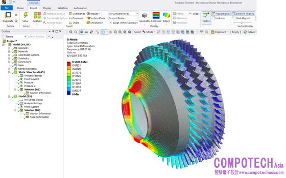 • Ansys Mechanical 2021 R2運用新多階段周期對稱功能簡化周期模態和結構分析,較完整的360度解決方案執行時間縮短多達50倍。