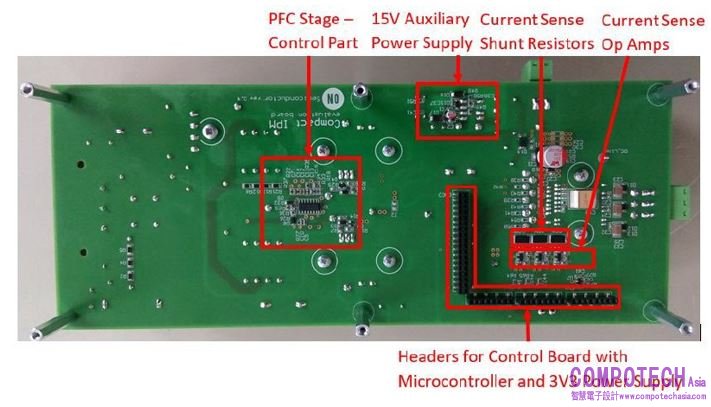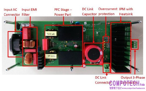 輸入230Vac之850W馬達驅動方案,具備功率因數調整器(Power Factor Correction)及EMI濾波電路;