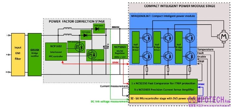 採用ON Semiconductor高集成模組NFAQ1060LT36T,內建3相高壓Inverter采DIP-S3包裝;