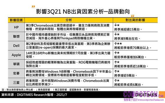 第2季前六大品牌出貨表現以華碩、聯想及宏?硌?佳,華碩因電競NB出貨表現強勢,排名超越蘋果(Apple)來到第四,聯想及宏碁皆受惠於Chromebook標案大增,出貨佔比皆較第1季提升。台灣代工廠則以組裝全球7成以上Chromebook的廣達表現最佳。