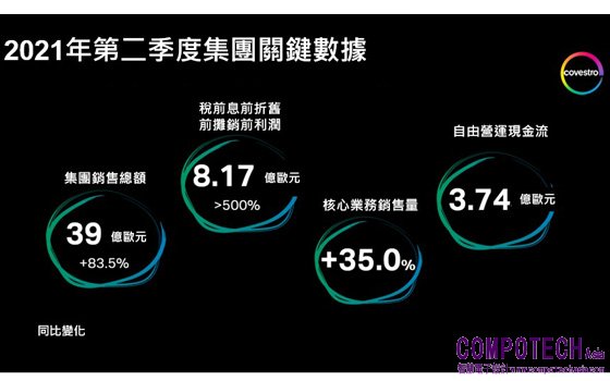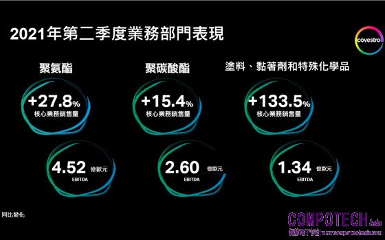 聚碳酸酯業務板塊2021年第二季度核心業務銷售量同比增加15.4%,主要得益於汽車和運輸產業在各大區域取得的銷量成長。因總銷售量和銷售價格上升,該板塊銷售額增長56.6%,至10億歐元左右(去年同期:6.48億歐元)。因利潤率大幅提升以及總銷售量上漲,EBITDA增至2.6億歐元 (去年同期:9,600萬歐元)。