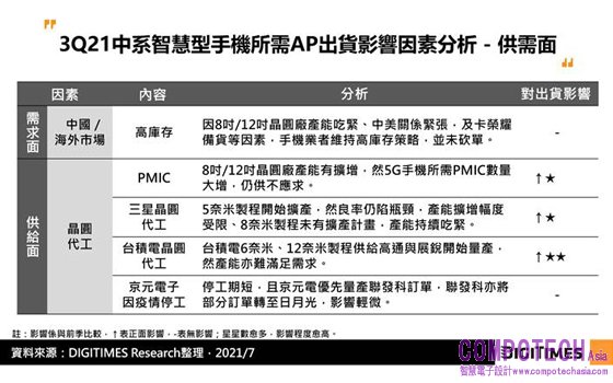 製程技術方面,因部分聯發科第1季4G AP遞延出貨,且晶圓代工廠電源管理IC (PMIC)產能擴增,2021年第2季出貨的中系智慧型手機用AP中,12奈米製程比重拉升至38.6%;第3季因5G AP高通驍龍778G、7375與聯發科天璣810等皆由台積電6奈米製程代工,良率佳且產能充足,將推升6/7/8奈米製程比重至40.1%,超越12奈米比重。