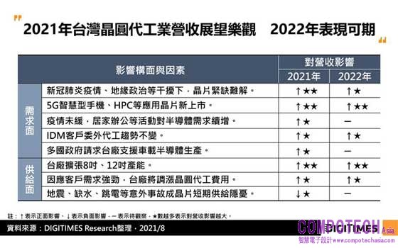 在新冠肺炎(COVID-19)疫情、地緣政治因素干擾下,2022年晶片緊缺恐持續,加上5G、高效能運算(HPC)、車用等晶片需求看增,客戶採長約綁定產能的情況已現;另一方面,晶圓代工價格可望再調漲,同時,台廠2022年將續擴產能,DIGITIMES Research預估,2022年三大台廠合計營收可望年增超過10%。