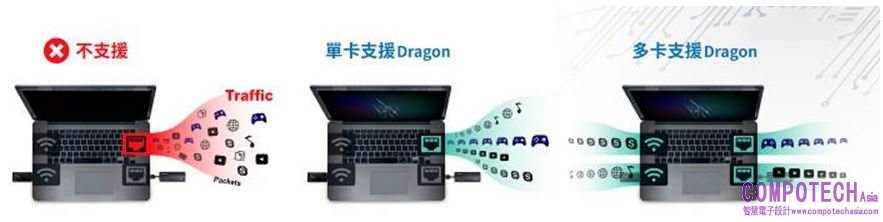 Dragon為瑞昱獨家開發的頻寬優化技術,軟硬體一同開發設計,相較於單純軟體設計更能達到頻寬優化,Dragon可依照使用者需求,自動排序應用程式優先權,如開啟「Work Mode工作模式」,軟體會將工作優先使用的線上應用程式等級拉高,而開啟「Game Mode遊戲模式」,軟體會將線上遊戲列為優先使用,不會發生延遲或是互搶頻寬問題,Dragon亦有多種模式可供消費者選擇。(如圖二)