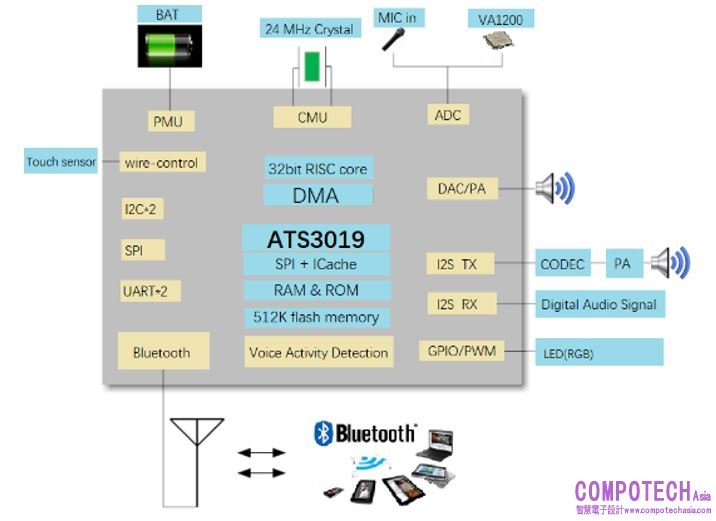 Actions是低功耗系統級晶片設計廠商,其主營業務是智能音頻SoC晶片及低功耗無線MCU的研發、設計及銷售。該公司專注於為無線音頻、智能穿戴、智能多媒體、語音交互及智慧物聯網等領域提供專業晶片及完整解決方案。ATC3019是Actions推出的新一代藍牙耳機晶片,其擁有藍牙5.0雙模配置,發射功率最高達10dBm,接收靈敏度為-95dBm,有效地提升了音頻連接的穩定性。在常規音頻播放的情況下空載功耗能夠低至5.xmA,同時支持低延時模式,藍牙音頻信號延時低至40ms。