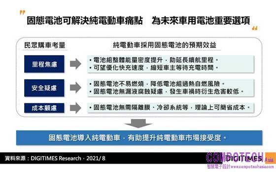 DIGITIMES Research分析師陳一帆表示,不少車廠投資入股固態電池新創,或與固態電池新創共同開發車用電池,以加速量產固態電池電動車。蔚來(NIO)目標2022年率先量產固態電池純電動車,宣稱續航距離將達1,000公里,豐田、福斯、寶馬、現代等傳統車廠則規劃於2025~2030年推出固態電池量產車型,期以優於鋰離子電池的續航里程吸引消費者青睞。