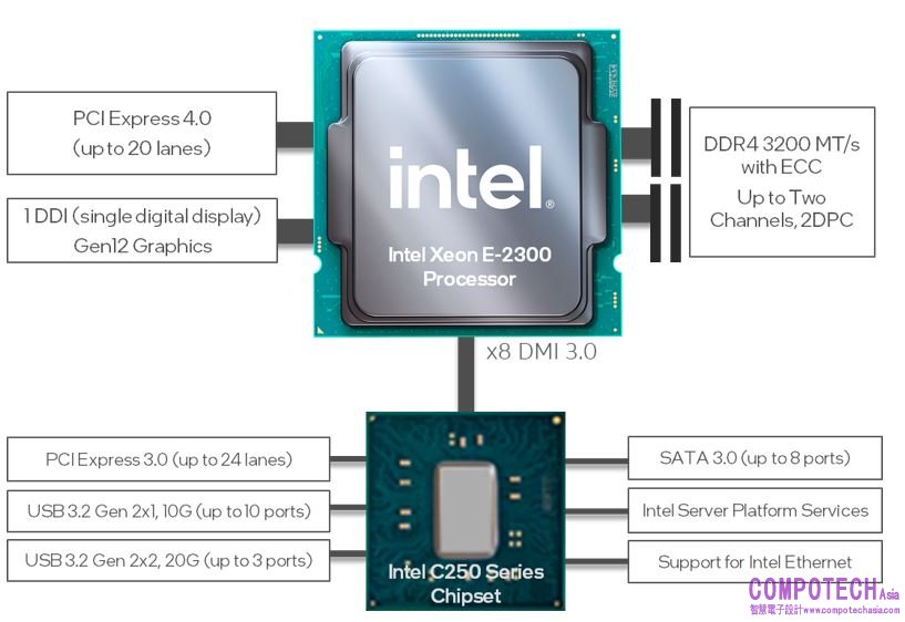 PCI Express 4.0-最多20通道(CPU) PCI Express 3.0-最多24通道(PCH) USB 3.2 Gen2x1(10G)-最多10埠 SATA 3.0-最多8埠 DMI-8通道,Gen 3 |